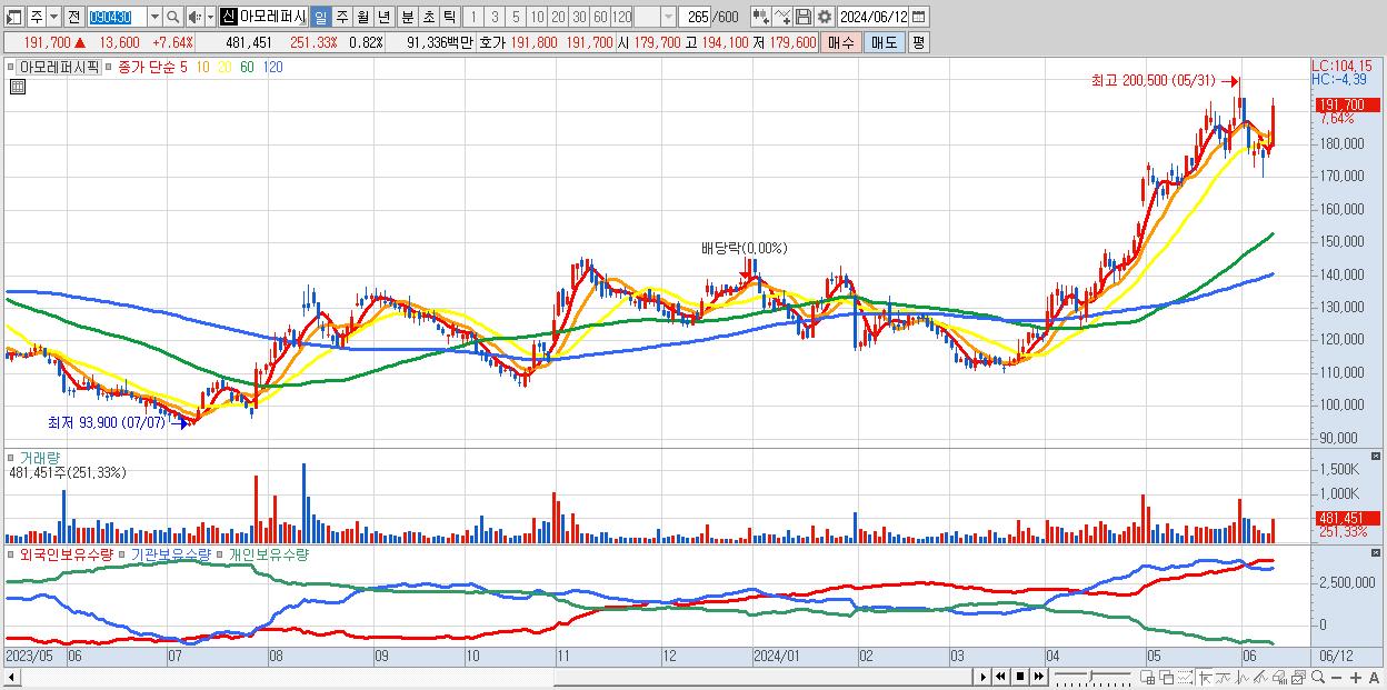 - 아모레퍼시픽 (191,700원 ▲ 7.64% , 시총: 112,131억, 외국인 순매수 거래금:188억)