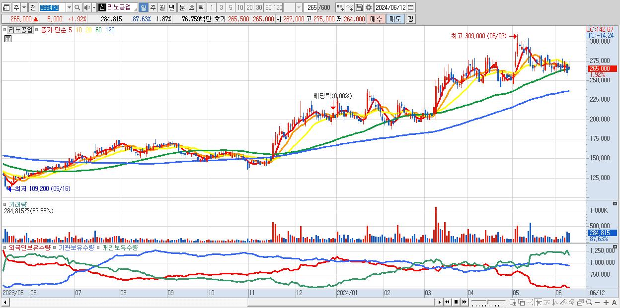 - 리노공업 (265,000원 ▲ 1.92% , 시총: 40,392억, 외국인 순매수 거래금:283억)