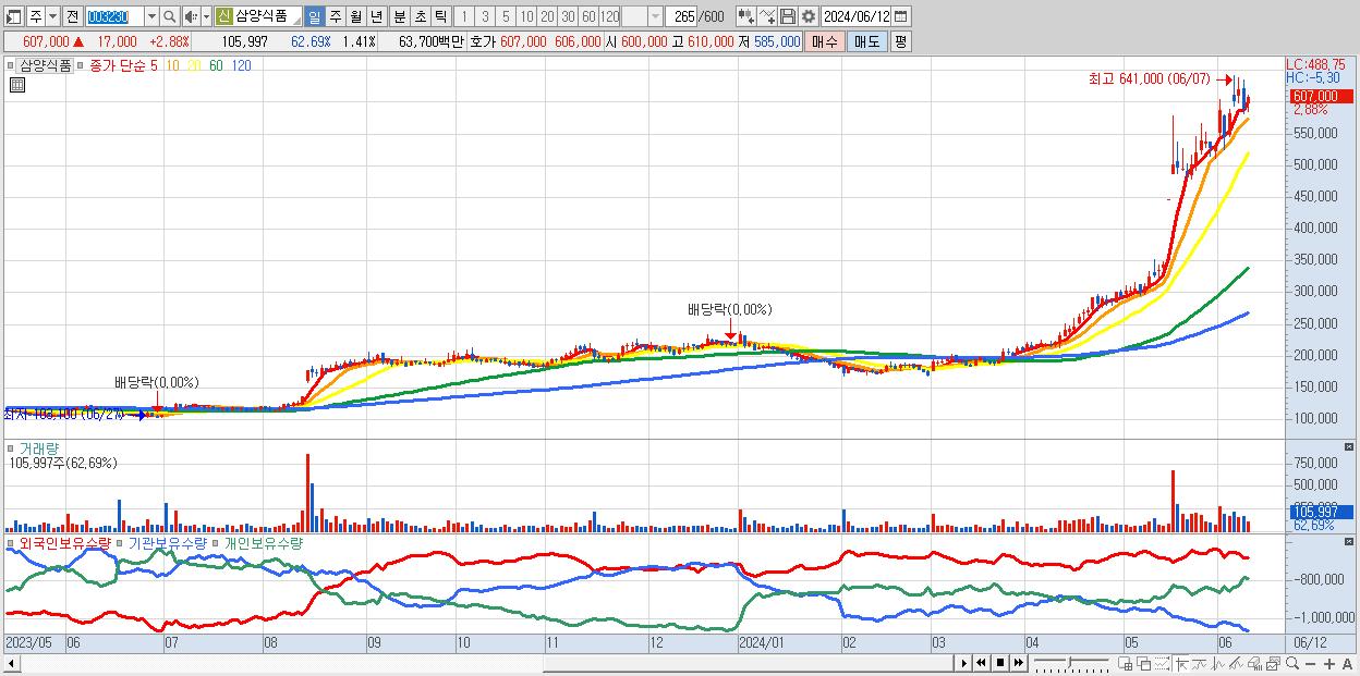 - 삼양식품 (607,000원 ▲ 2.88% , 시총: 45,725억, 외국인 순매수 거래금:86억)