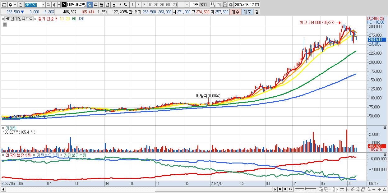 - HD현대일렉트릭 (263,500원 ▼ -3.3% , 시총: 94,984억, 외국인 순매수 거래금:79억)