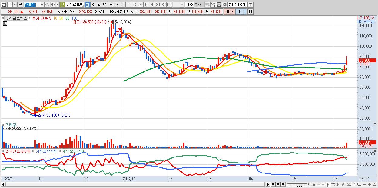 - 두산로보틱스 (86,200원 ▲ 6.95% , 시총: 55,875억, 외국인 순매수 거래금:254억)