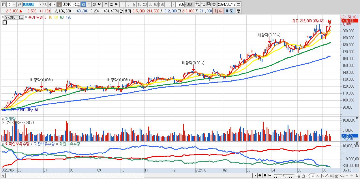 - SK하이닉스 (215,000원 ▲ 1.18% , 시총: 1,565,205억, 외국인 순매수 거래금:1,223억)