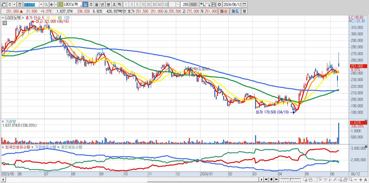 - LG이노텍 (251,000원 ▲ 9.37% , 시총: 59,404억, 외국인 순매수 거래금:393억)