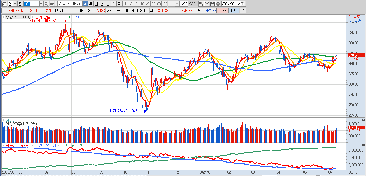 | 06/12 | 870.67 | ▲0.27% | -187억 | 314억 | 37억 | -164억 |