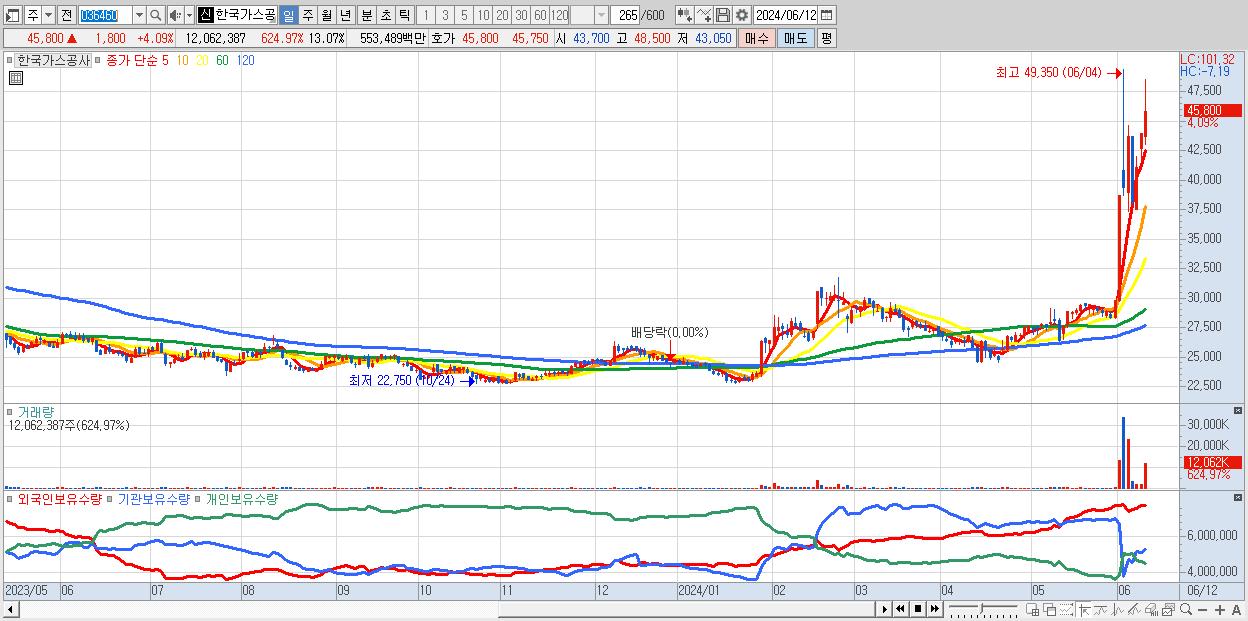 - 한국가스공사 (45,800원 ▲ 4.09% , 시총: 42,279억, 거래량: 12,062,387, 거래대금:5,535억)