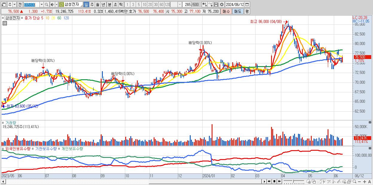 1.삼성전자 76,500원 ▲ 1.73% (KOSPI, 005930)