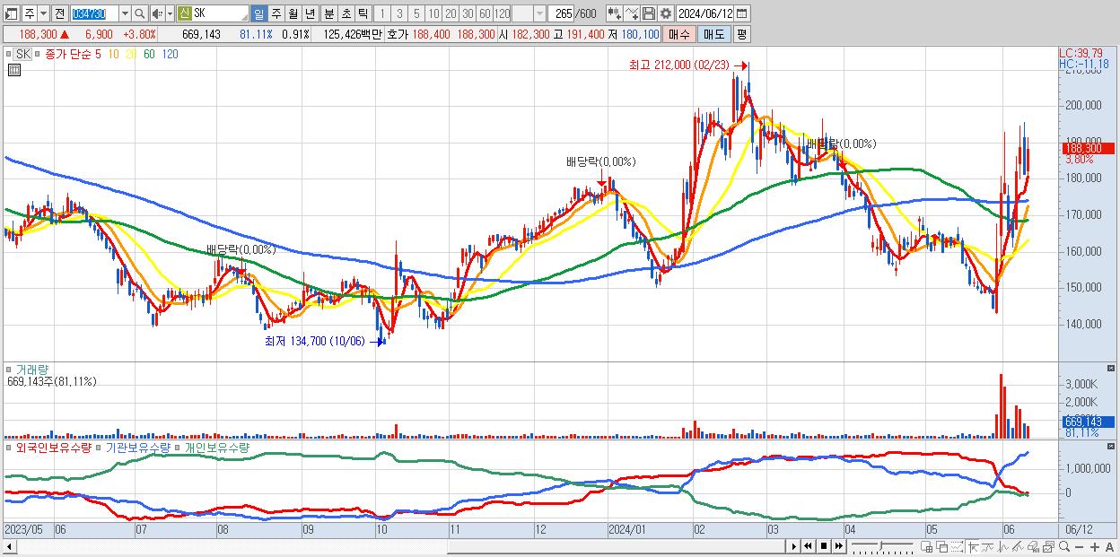 - SK (188,300원 ▲ 3.8% , 시총: 137,832억, 거래량: 669,143, 거래대금:1,254억)