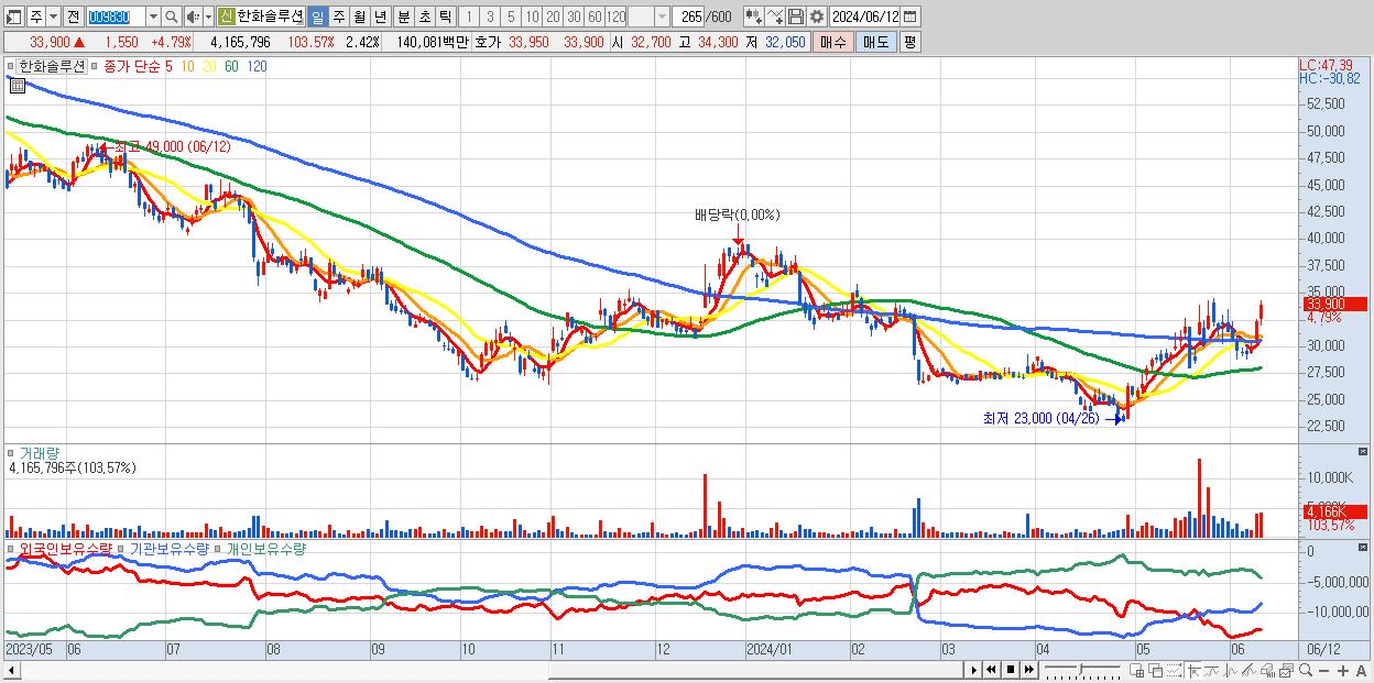 - 한화솔루션 (33,900원 ▲ 4.79% , 시총: 58,272억, 거래량: 4,165,796, 거래대금:1,401억)