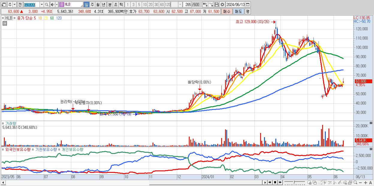 - HLB (63,600원 ▲ 4.95% , 시총: 83,218억, 외국인 순매수 거래금:359억)