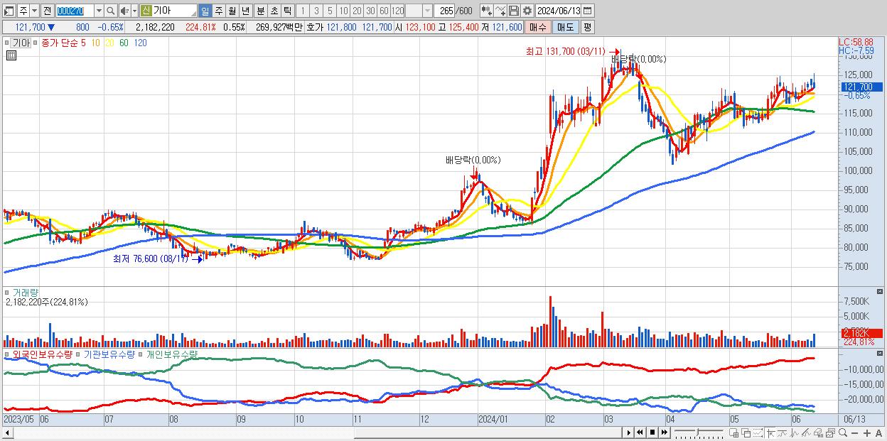- 기아 (121,700원 ▼ -0.65% , 시총: 486,628억, 외국인 순매수 거래금:529억)