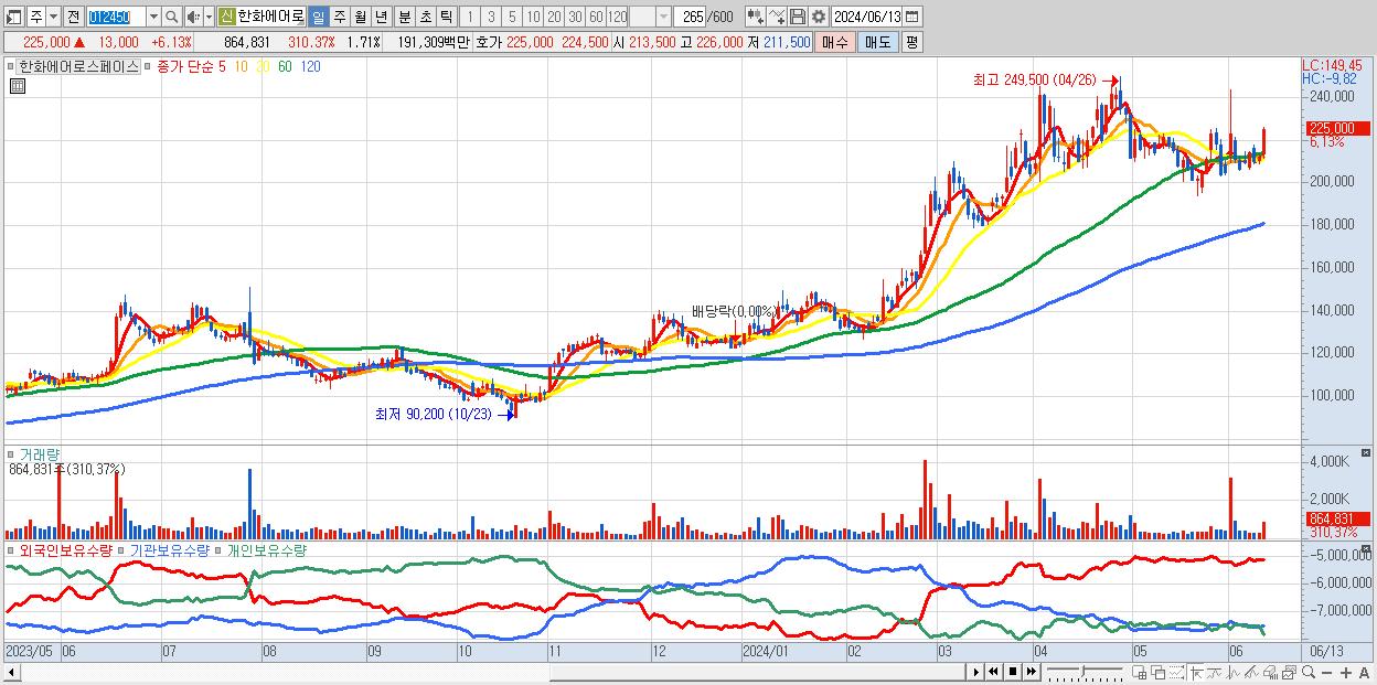 - 한화에어로스페이스 (225,000원 ▲ 6.13% , 시총: 113,918억, 외국인 순매수 거래금:616억)