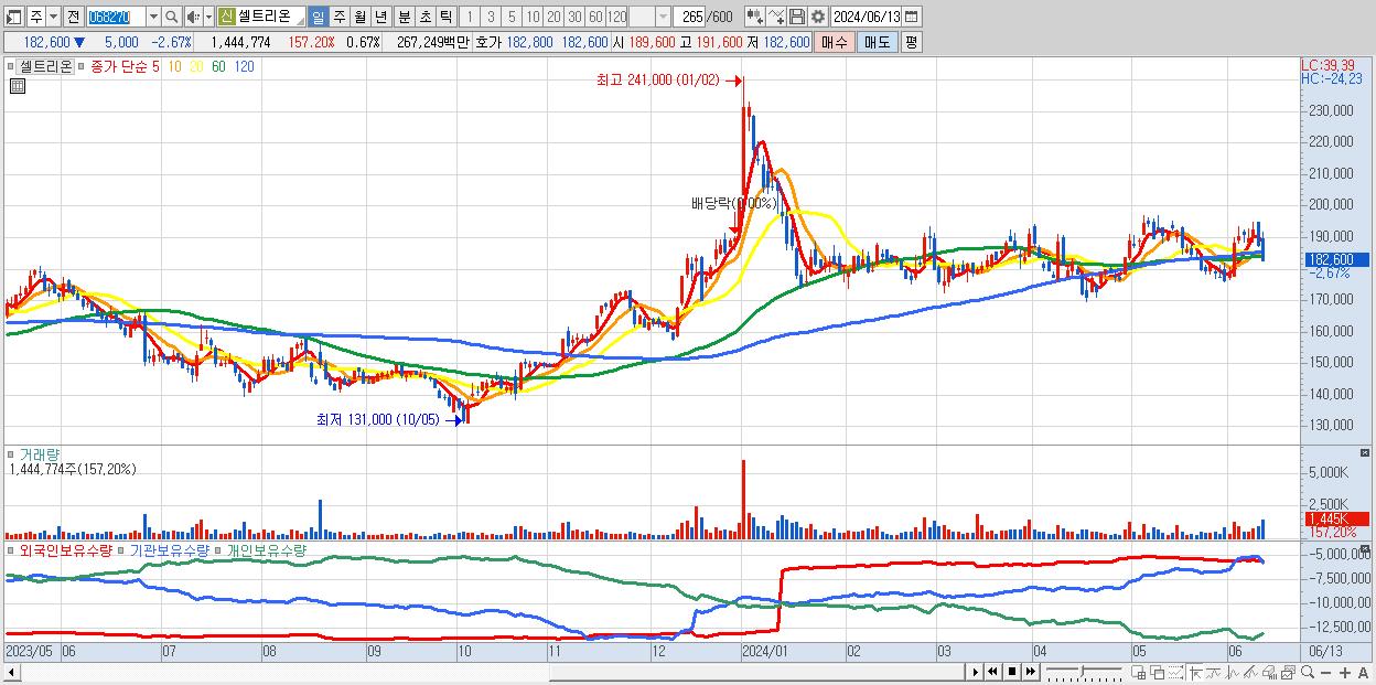 - 셀트리온 (182,600원 ▼ -2.67% , 시총: 396,230억, 외국인 순매수 거래금:238억)