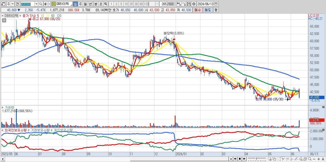 - DB하이텍 (40,600원 ▼ -5.47% , 시총: 18,026억, 외국인 순매수 거래금:146억)