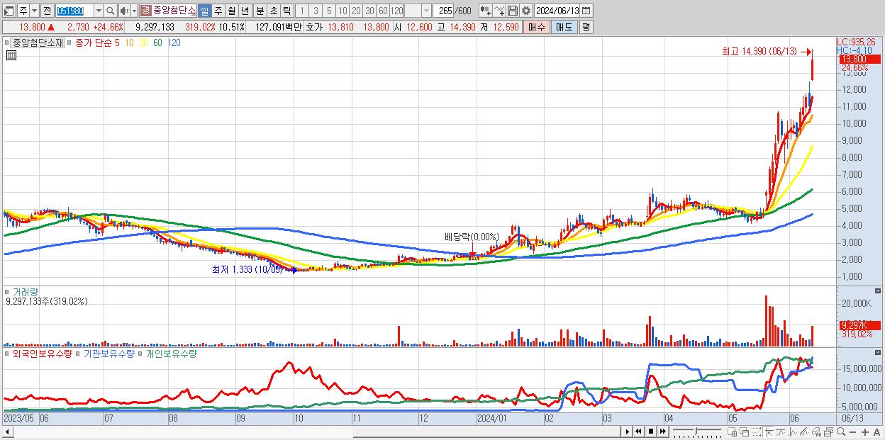 - 중앙첨단소재 (13,800원 ▲ 24.66% , 시총: 12,203억, 외국인 순매수 거래금:103억)