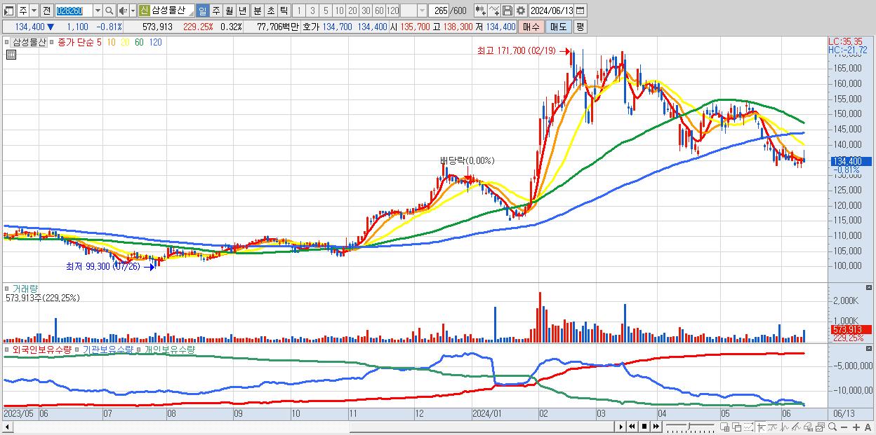 - 삼성물산 (134,400원 ▼ -0.81% , 시총: 238,942억, 외국인 순매수 거래금:204억)