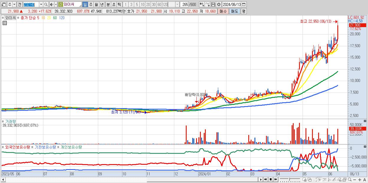 - 와이씨 (21,900원 ▲ 17.62% , 시총: 17,968억, 외국인 순매수 거래금:278억)