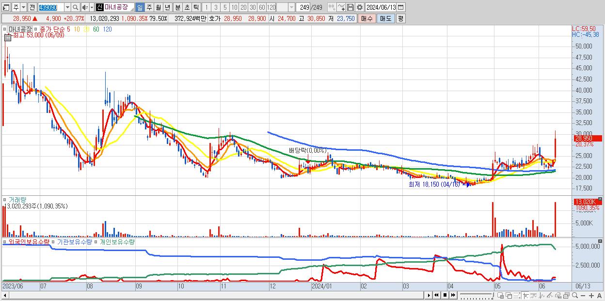 - 마녀공장 (28,950원 ▲ 20.37% , 시총: 4,742억, 외국인 순매수 거래금:136억)