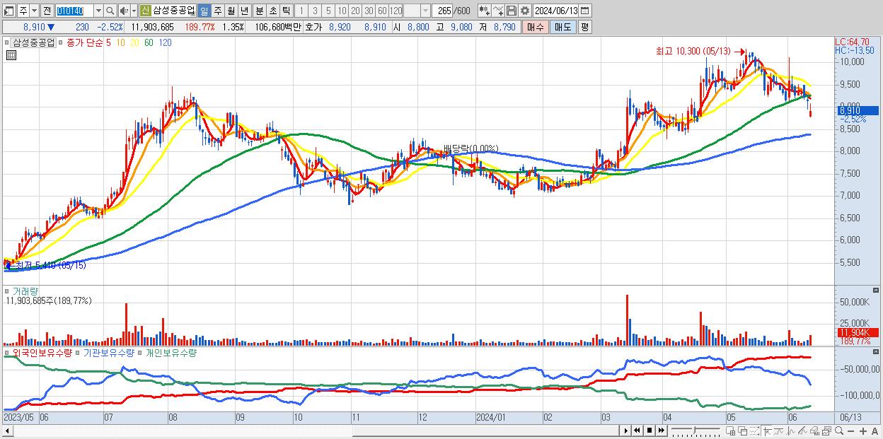 - 삼성중공업 (8,910원 ▼ -2.52% , 시총: 78,408억, 외국인 순매수 거래금:169억)