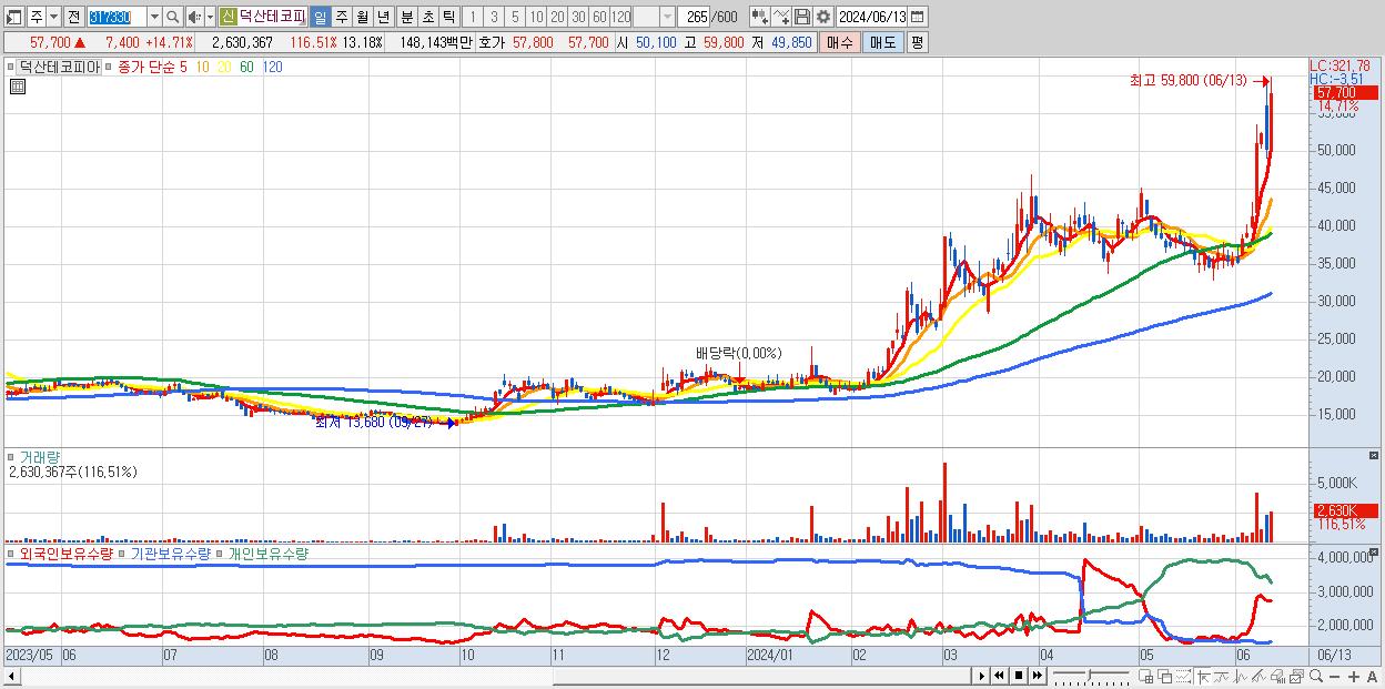 - 덕산테코피아 (57,700원 ▲ 14.71% , 시총: 11,517억, 외국인 순매수 거래금:115억)