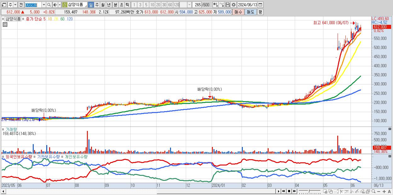 - 삼양식품 (612,000원 ▲ 0.82% , 시총: 46,102억, 외국인 순매수 거래금:157억)