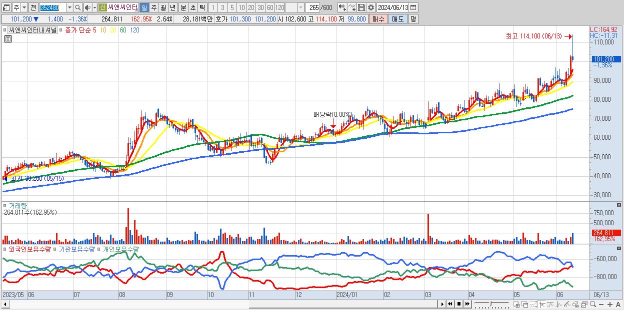 - 씨앤씨인터내셔널 (101,200원 ▼ -1.36% , 시총: 10,134억, 외국인 순매수 거래금:90억)