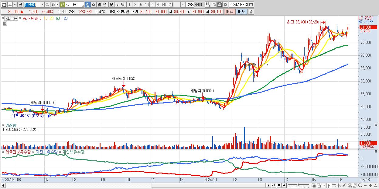 - KB금융 (81,000원 ▲ 2.4% , 시총: 326,844억, 외국인 순매수 거래금:282억)