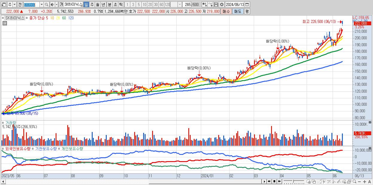 - SK하이닉스 (222,000원 ▲ 3.26% , 시총: 1,616,165억, 외국인 순매수 거래금:3,573억)