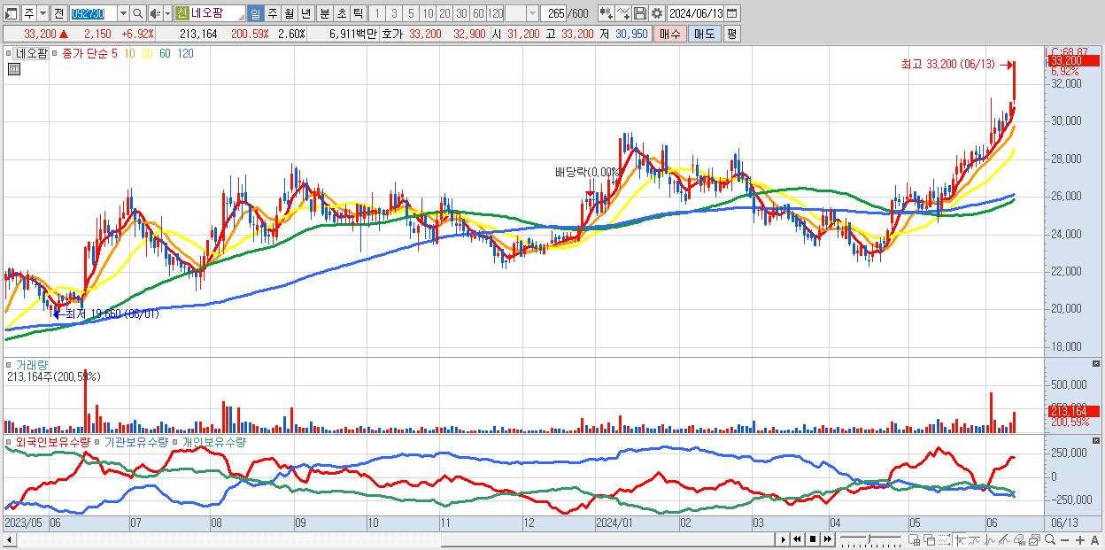 - 네오팜 (33,200원 ▲ 6.92% , 시총: 2,725억, 거래량: 213,164, 거래대금:69억, KOSDAQ)