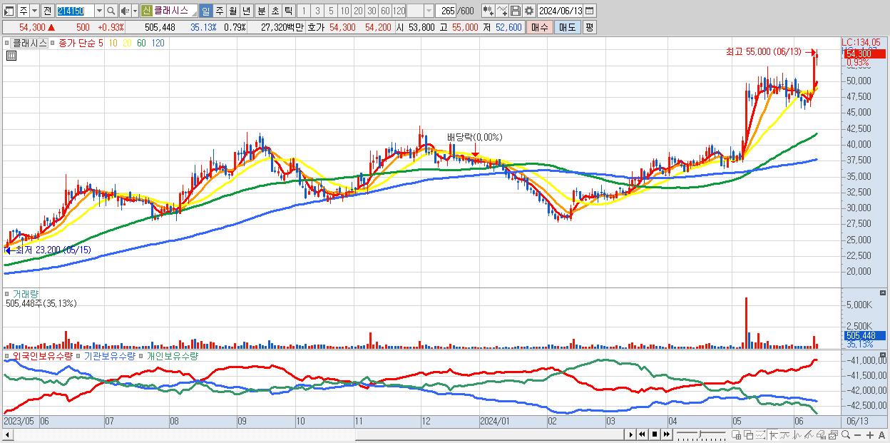 - 클래시스 (54,300원 ▲ 0.93% , 시총: 34,752억, 거래량: 505,448, 거래대금:273억, KOSDAQ)