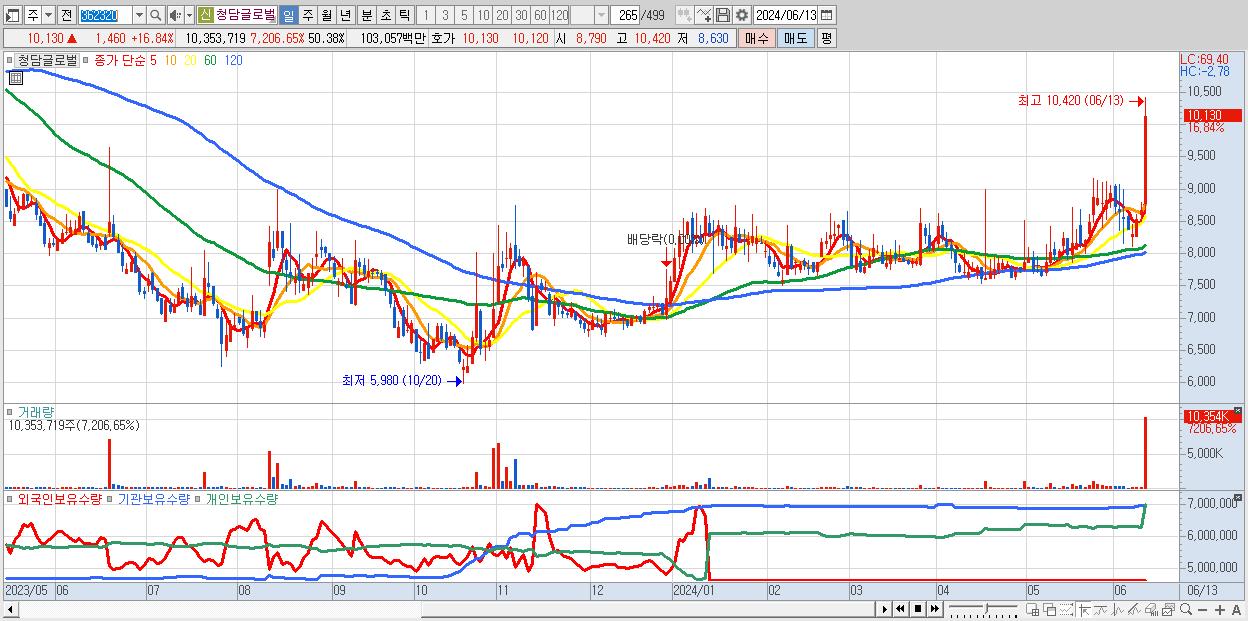 - 청담글로벌 (10,130원 ▲ 16.84% , 시총: 2,082억, 거래량: 10,353,719, 거래대금:1,031억, KOSDAQ)