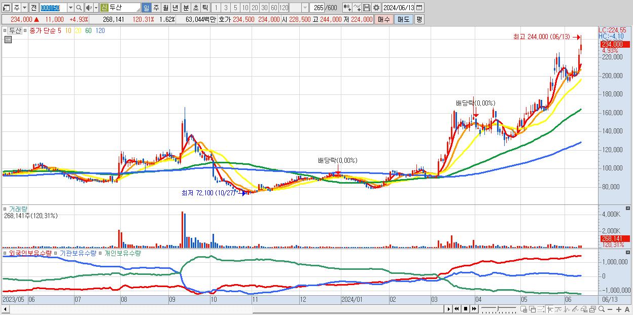 - 두산 (234,000원 ▲ 4.93% , 시총: 38,666억, 거래량: 268,141, 거래대금:630억, KOSPI)