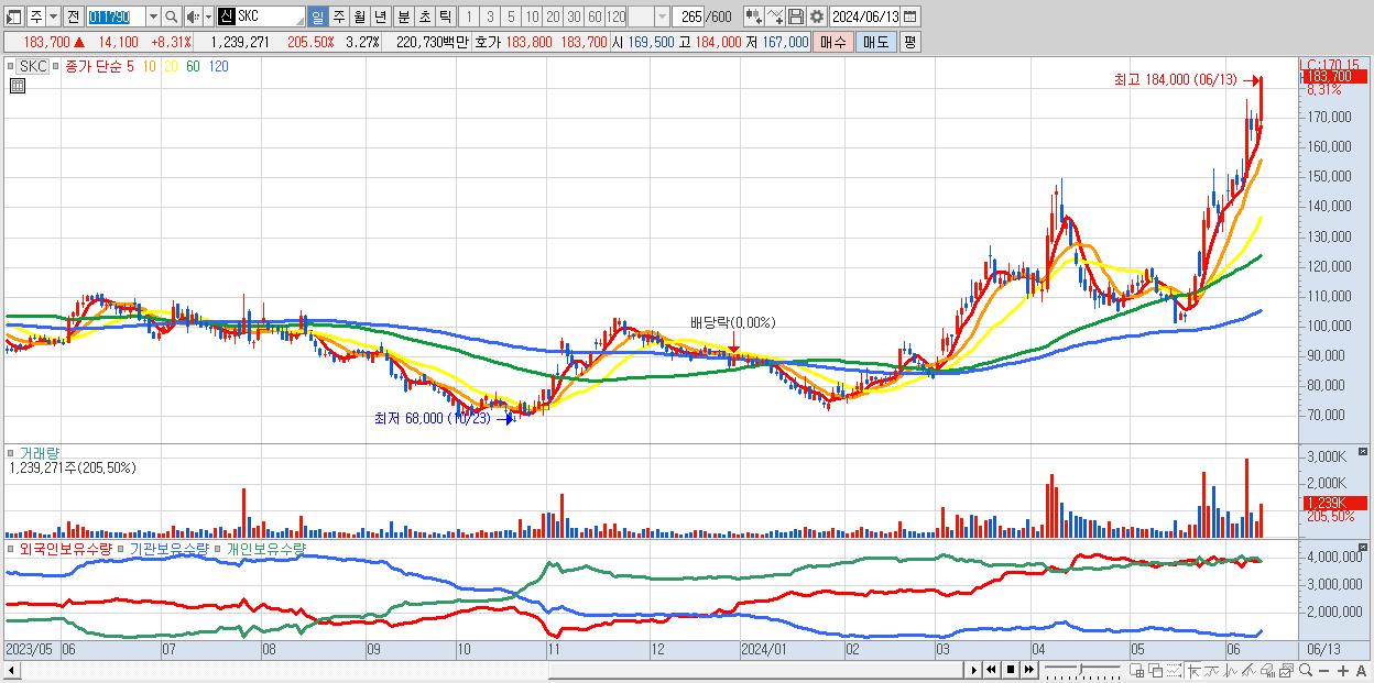 - SKC (183,700원 ▲ 8.31% , 시총: 69,564억, 거래량: 1,239,271, 거래대금:2,207억, KOSPI)