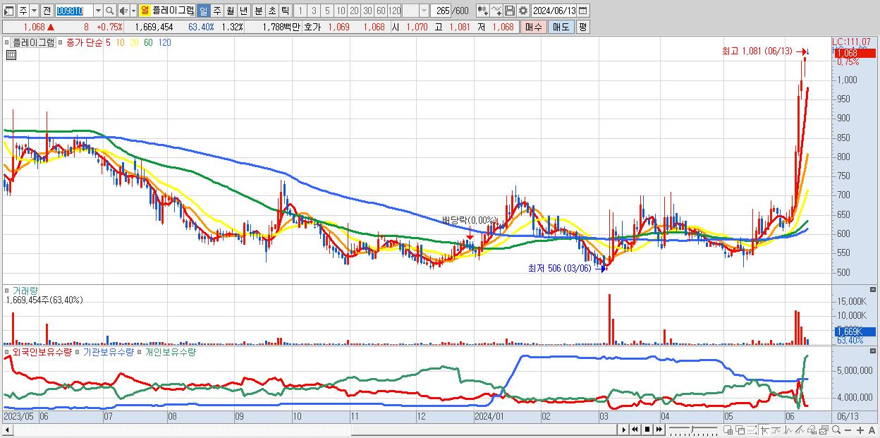 - 플레이그램 (1,068원 ▲ 0.75% , 시총: 1,354억, 거래량: 1,669,454, 거래대금:18억, KOSPI)