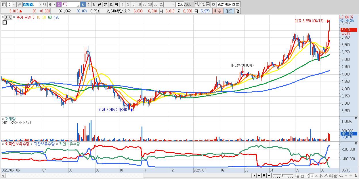 - JTC (6,010원 ▲ 0.33% , 시총: 3,110억, 거래량: 361,062, 거래대금:22억, KOSDAQ)