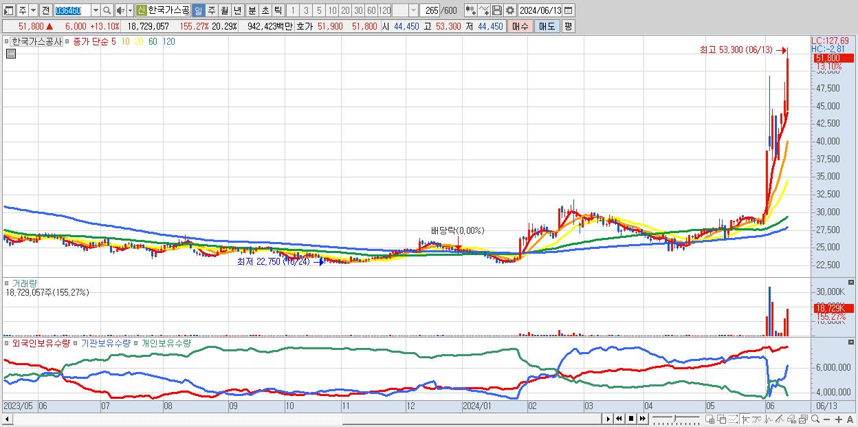 - 한국가스공사 (51,800원 ▲ 13.1% , 시총: 47,818억, 거래량: 18,729,057, 거래대금:9,424억, KOSPI)