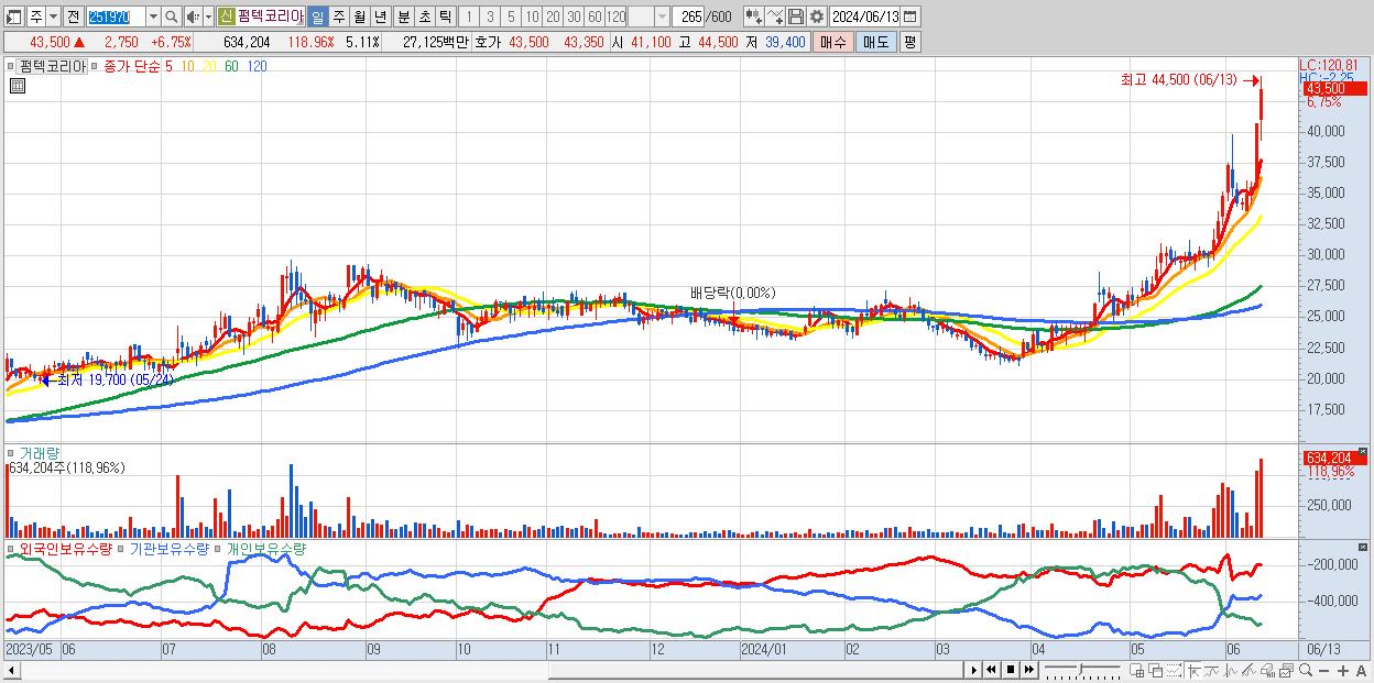 - 펌텍코리아 (43,500원 ▲ 6.75% , 시총: 5,394억, 거래량: 634,204, 거래대금:271억, KOSDAQ)