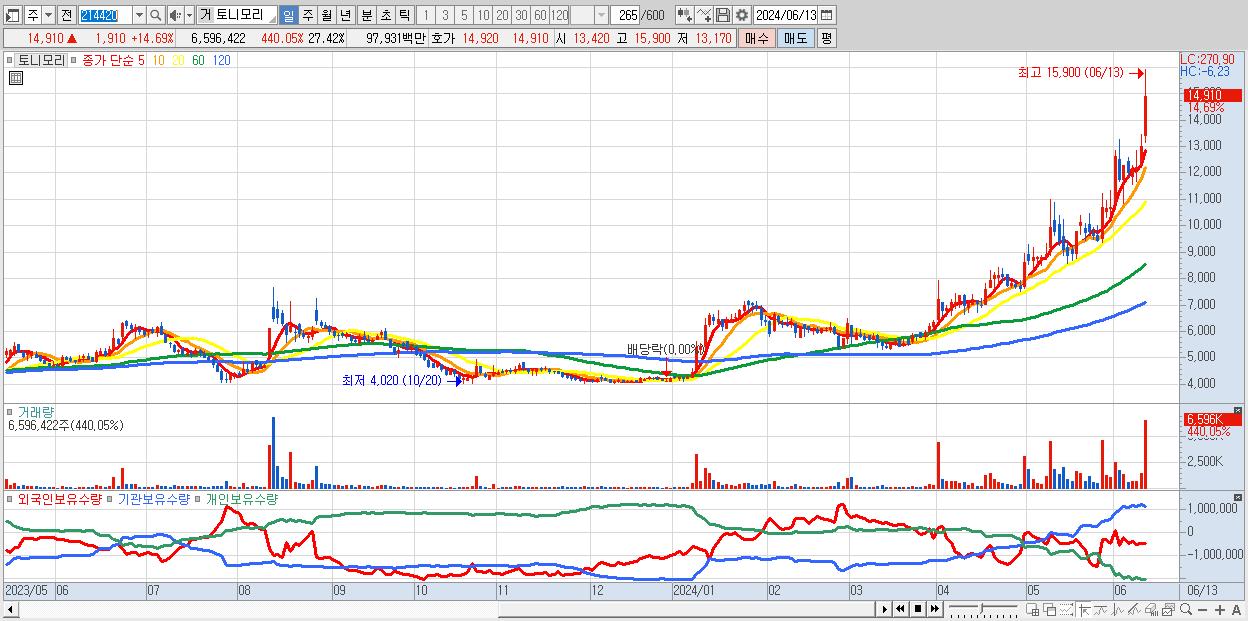 - 토니모리 (14,910원 ▲ 14.69% , 시총: 3,587억, 거래량: 6,596,422, 거래대금:979억, KOSPI)