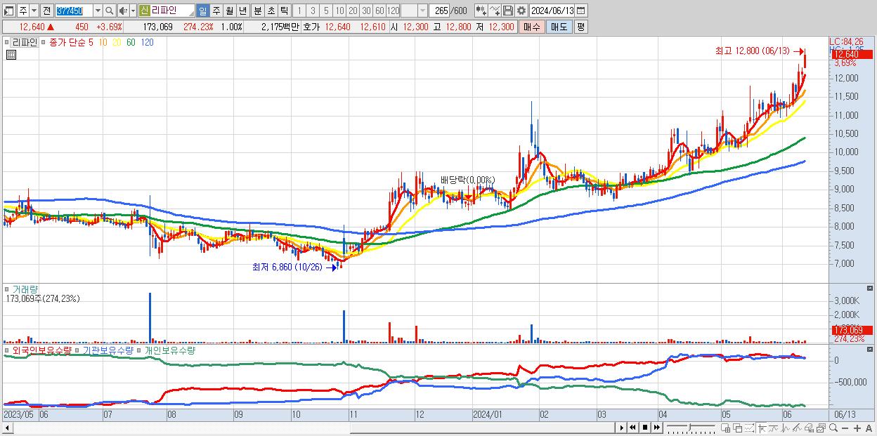 - 리파인 (12,640원 ▲ 3.69% , 시총: 2,191억, 거래량: 173,069, 거래대금:22억, KOSDAQ)
