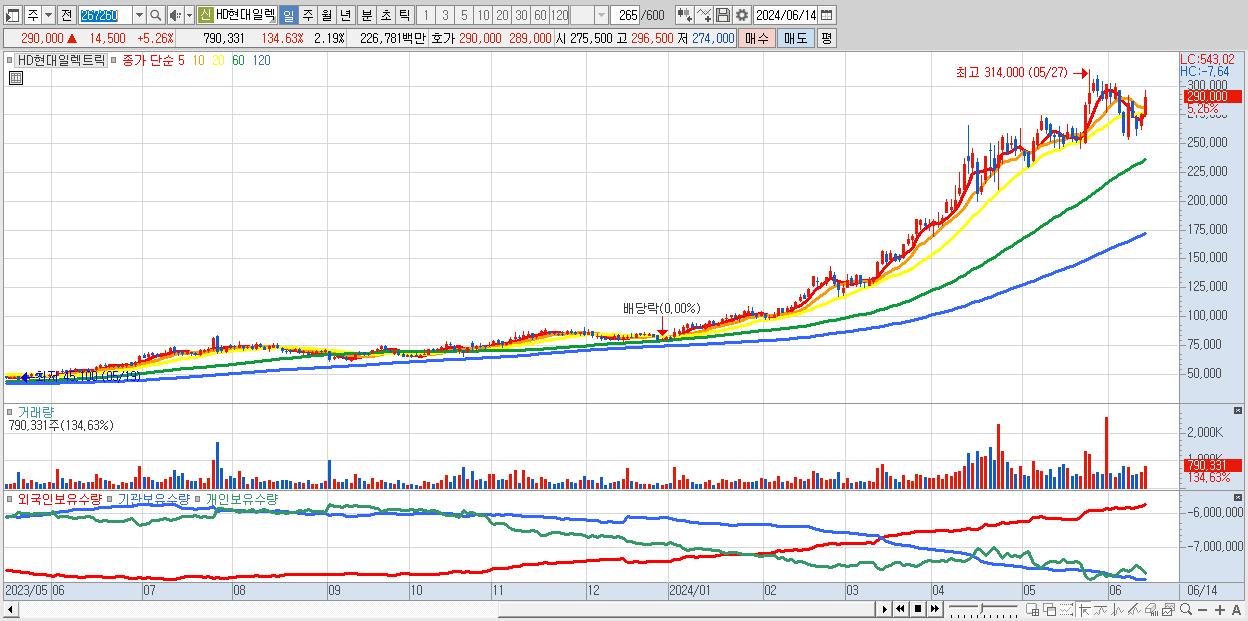 - HD현대일렉트릭 (290,000원 ▲ 5.26% , 시총: 104,537억, 거래량: 790,331, 거래대금:2,268억)