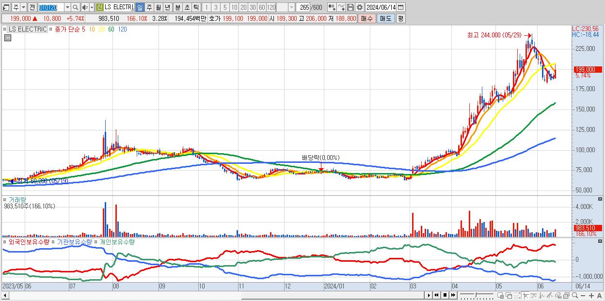 - LS ELECTRIC (199,000원 ▲ 5.74% , 시총: 59,700억, 거래량: 983,510, 거래대금:1,945억)