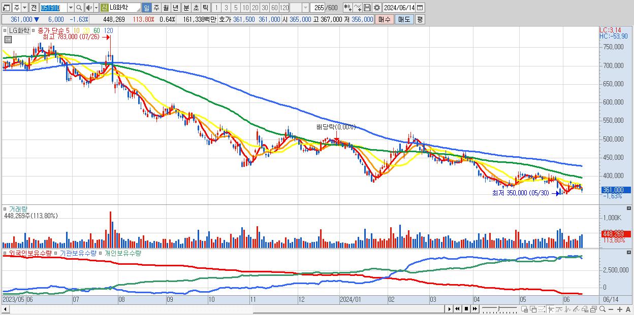 - LG화학 (361,000원 ▼ -1.63% , 시총: 254,838억, 거래량: 448,269, 거래대금:1,613억)