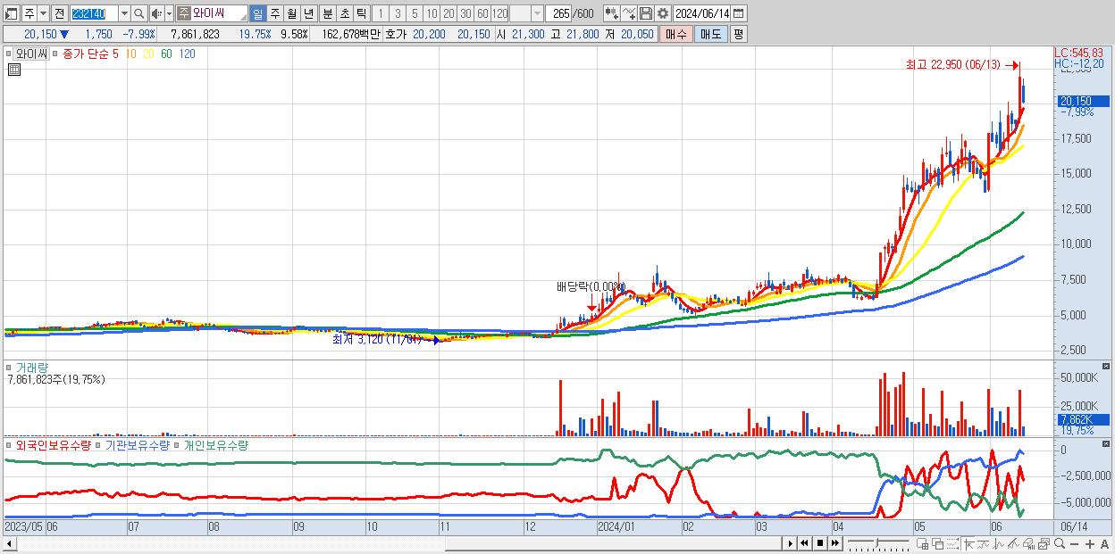 - 와이씨 (20,150원 ▼ -7.99% , 시총: 16,532억, 거래량: 7,861,823, 거래대금:1,627억)