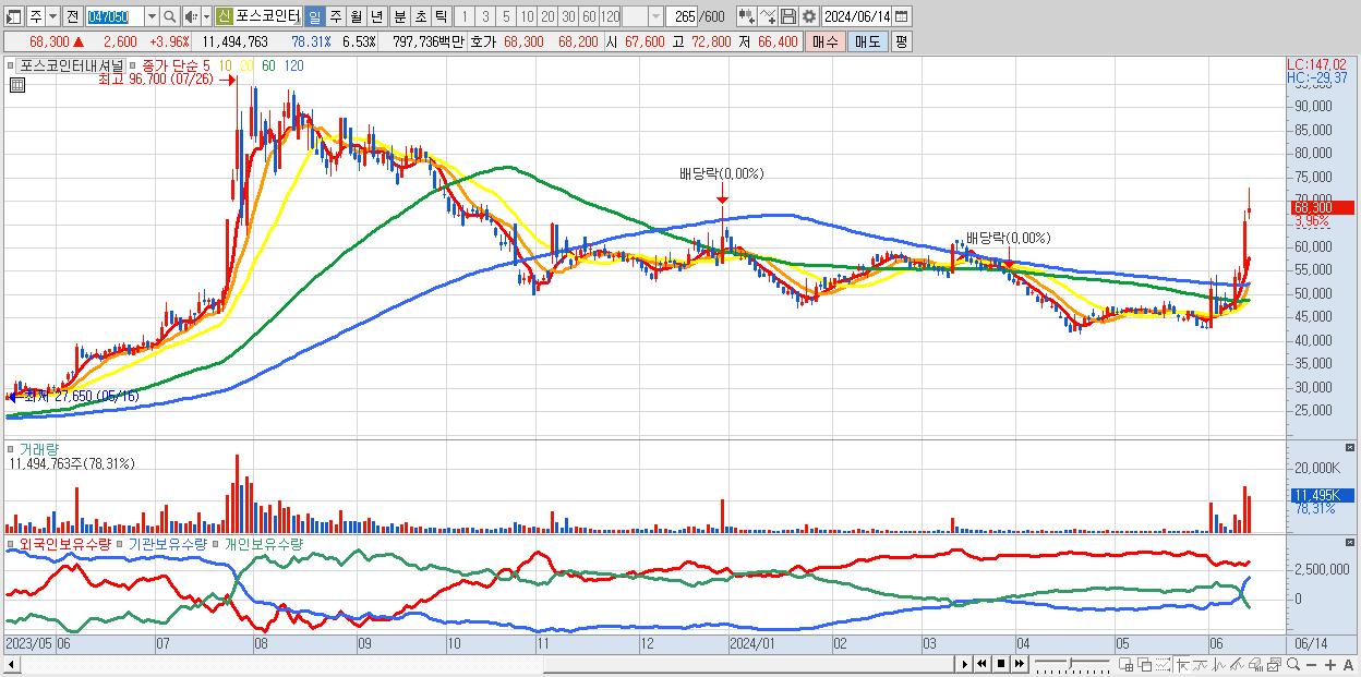 - 포스코인터내셔널 (68,300원 ▲ 3.96% , 시총: 120,155억, 거래량: 11,494,763, 거래대금:7,977억)