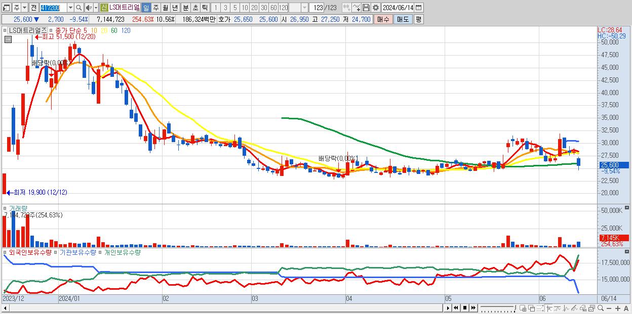 - LS머트리얼즈 (25,600원 ▼ -9.54% , 시총: 17,319억, 거래량: 7,144,723, 거래대금:1,863억)