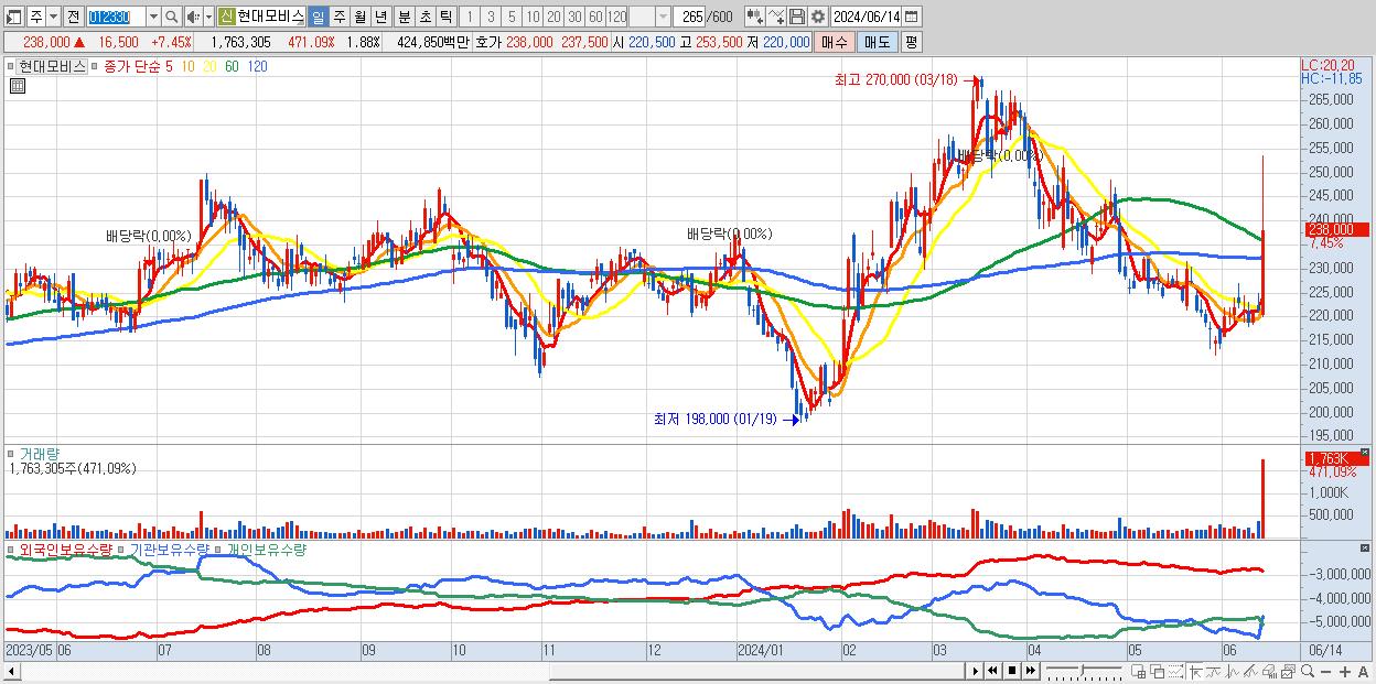 - 현대모비스 (238,000원 ▲ 7.45% , 시총: 222,899억, 거래량: 1,763,305, 거래대금:4,248억)