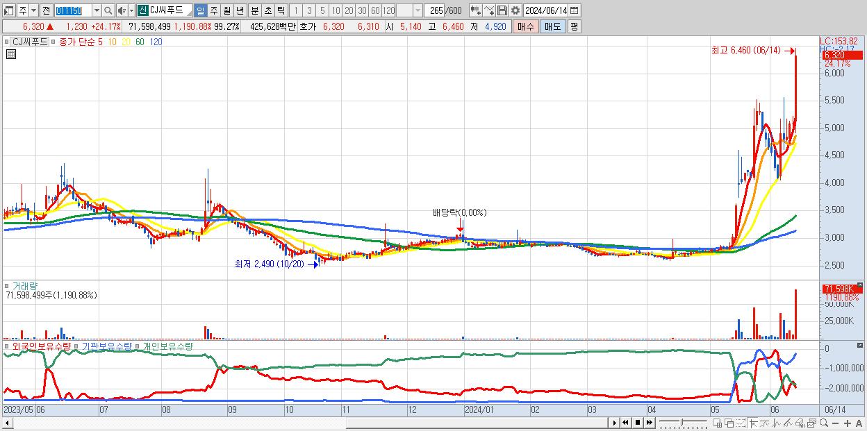 - CJ씨푸드 (6,320원 ▲ 24.17% , 시총: 2,271억, 거래량: 71,598,499, 거래대금:4,256억)