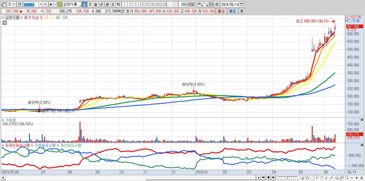 - 삼양식품 (647,000원 ▲ 5.72% , 시총: 48,739억, 거래량: 330,275, 거래대금:2,175억)