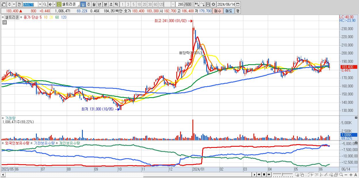 - 셀트리온 (183,400원 ▲ 0.44% , 시총: 397,966억, 거래량: 1,006,471, 거래대금:1,844억)