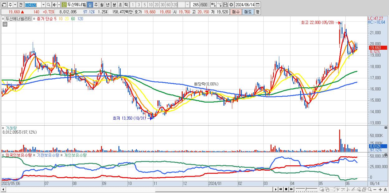 - 두산에너빌리티 (19,660원 ▲ 0.72% , 시총: 125,934억, 거래량: 8,012,095, 거래대금:1,585억)