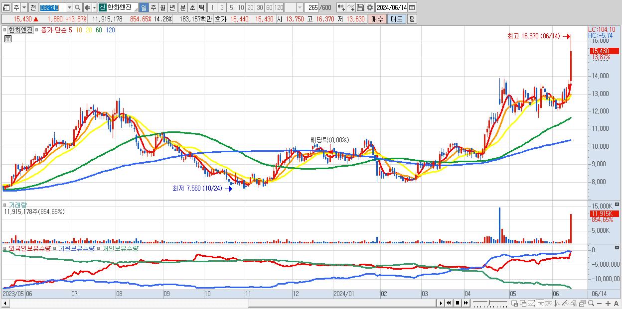 - 한화엔진 (15,430원 ▲ 13.87% , 시총: 12,876억, 거래량: 11,915,178, 거래대금:1,832억)